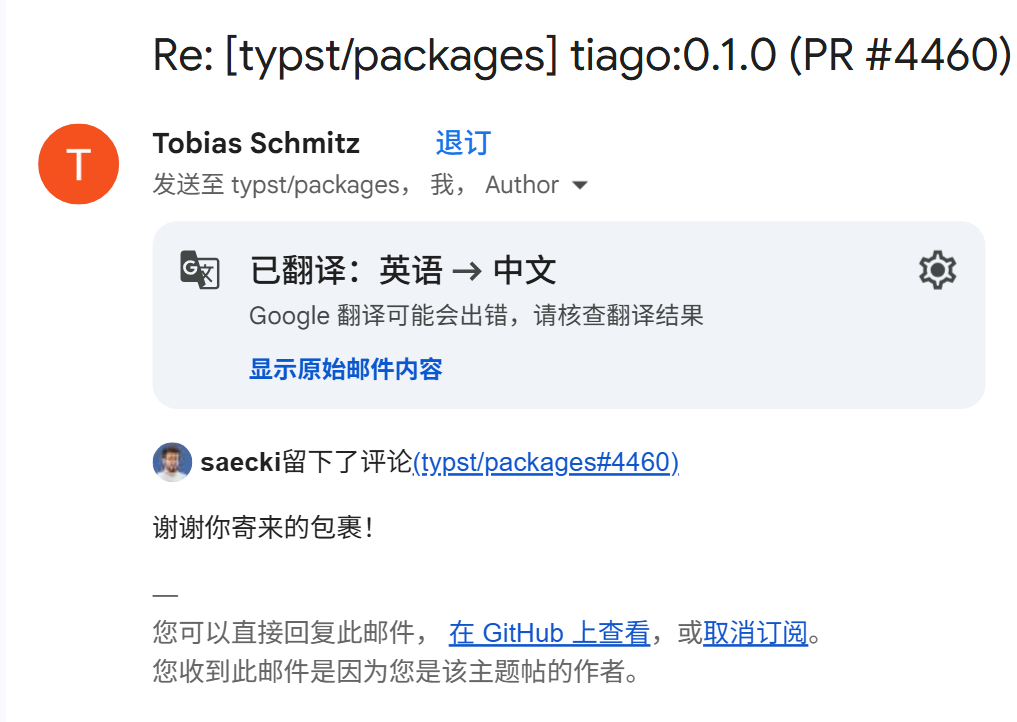 我查阅邮箱。我周末提交的 Typst 包裹 tiago 合并到 Universe 里了。我在 Typst 的 Discord 的 showcase 发了个贴。群友称,MoonBit + Typst,是“强强联合”。tailscale 的两条 issue 里 mention 到了我,一看原来是鸿蒙支持的 issue。